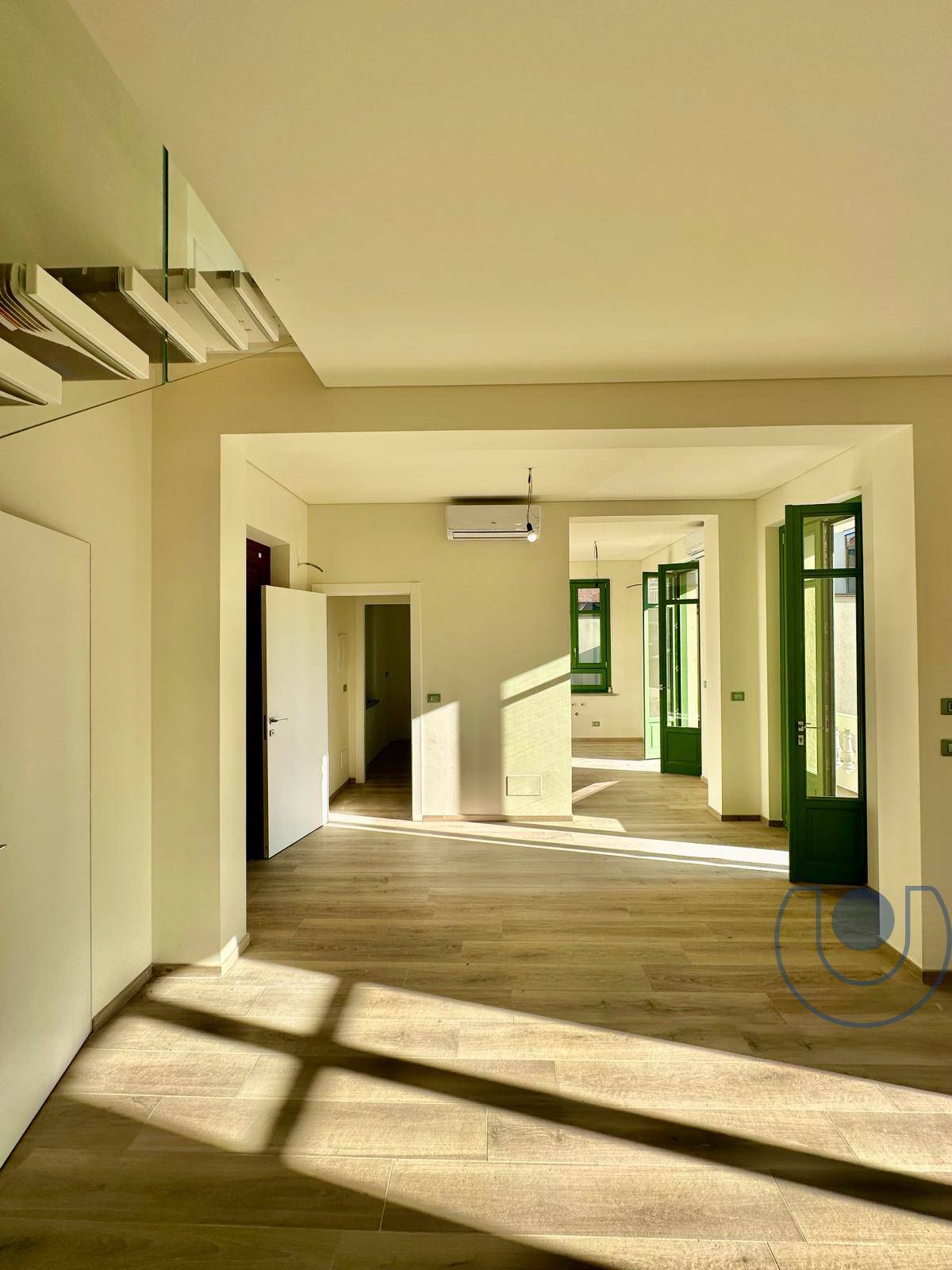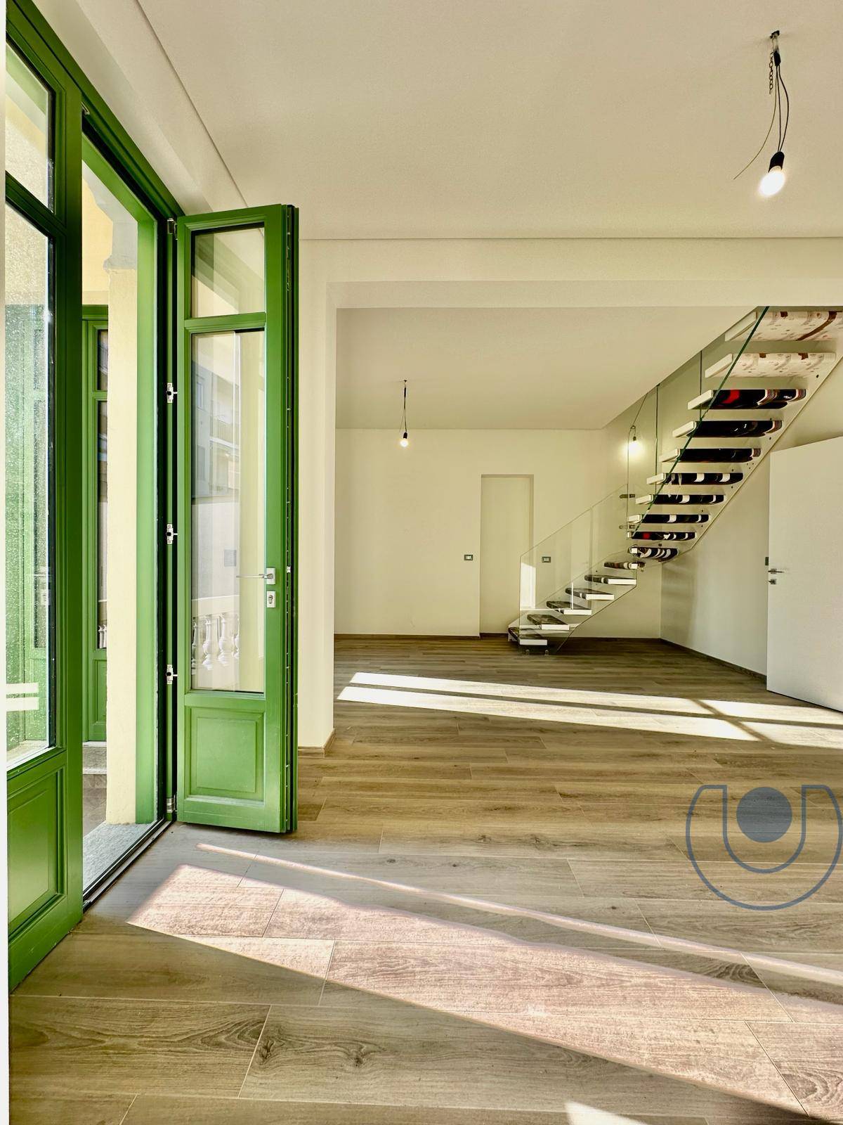 L'interno è così composto: ingresso su un ampio soggiorno estremamente luminoso grazie all'eposizione a sud e le ampie vetrate storiche, la cucina è abitabile con accesso diretto al primo balcone con balaustre originarie del tempo con passaggio diretto al giardino di circa 1000 mq. Inoltre vi è già un primo servizio con sanitari sospesi.