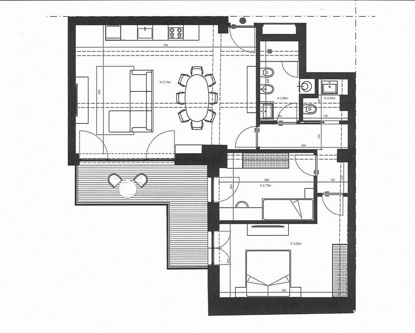 L'alloggio, sito al primo piano è così strutturato: Ingresso living in ampio soggiorno con cucina a vista, due camere e due bagni.