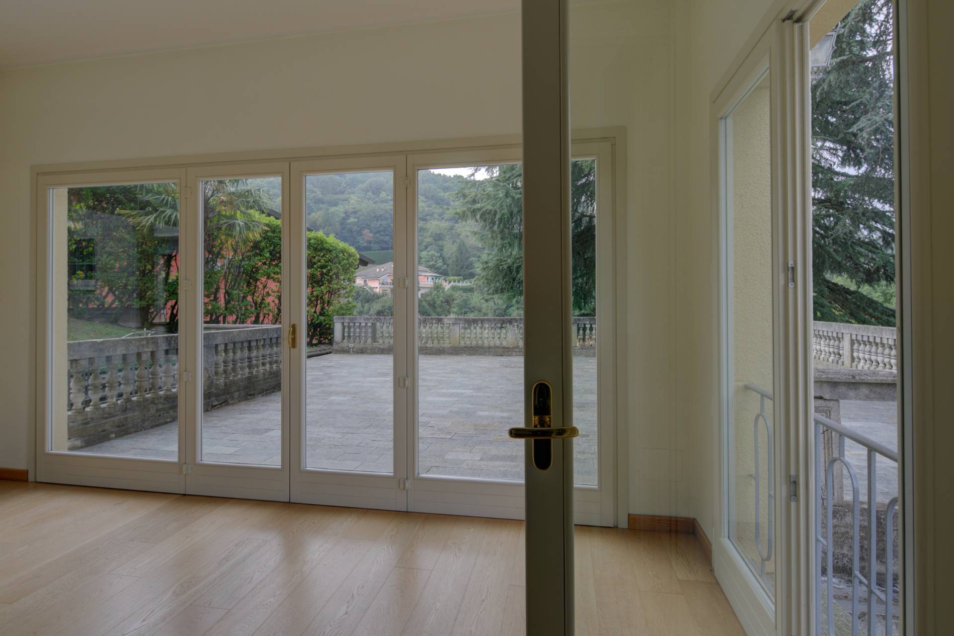 Scendendo al piano inferiore (piano terra lato valle e seminterrato lato monte), si apre una piacevole zona giorno composta dall'attuale cucina e da un'area soggiorno/pranzo che si affaccia direttamente su una veranda completamente vetrata, ideale per vivere la casa in ogni stagione. Da qui si accede al grande terrazzo esterno di oltre 100 mq, uno spazio esclusivo e perfetto per godersi momenti di relax o convivialità all'aperto.
