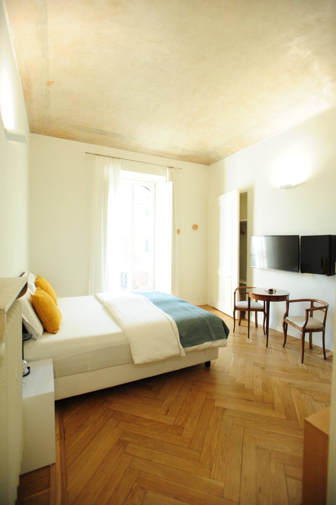 La camera è totalmente e finemente arredata ed è presente un letto matrimoniale oltre a servizi di fibra ottica wifi, climatizzatore, smart tv full hd e frigobar.